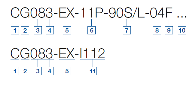 Пример обозначения: CG083-EX-11P-90S/L-04F ...